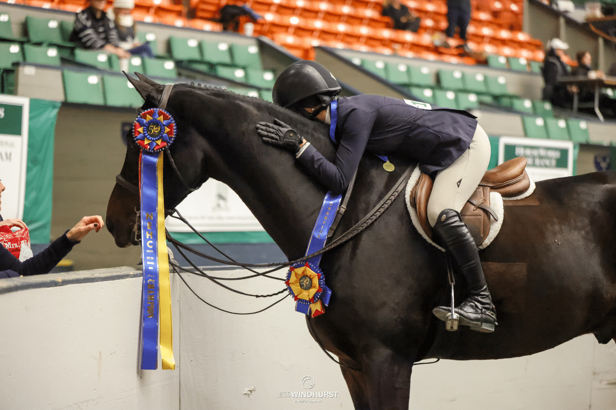 Springfield, MA — Emma Hakim aboard her long-term partner, Cento Chico, bested a field of 180 horse-and-rider combinations at the 2025 New England Equitation Junior Medal Final Championships in Springfield, MA. A panel of six seasoned judges included Hope Glynn, Mark Jungherr, Ken Krome, Jimmy Lee, Tiffany Morrissey, and Jack Towell. Hakim and Cento Chic started the morning off with an impressive average score first round score of 89.66. The top twenty-five riders were invited back to challenge a technical second round. Hakim and Cento were the last to go as they were the leading pair from the first round. Scoring another remarkable average score of 91, the pair finished victorious. Congratulations Emma and the team behind her!
